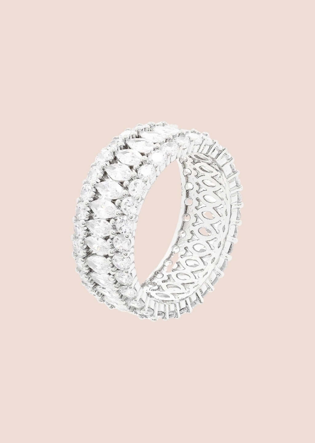O design criativo do Anel Glória se destaca por sua fileira de zirconias lapidadas em navete, dispostas transversalmente, criando um efeito visual de rara beleza estética. Cada detalhe foi cuidadosamente elaborado para garantir que você se sinta especial em qualquer ocasião.